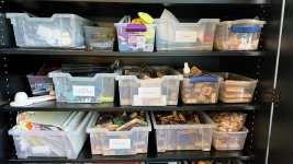 Our popup photography/videography studio includes movable partitions, a wall-mounted green screen, pull-down white background, video camera, light kit, audio recorder, light boxes, and wired lapel microphone.