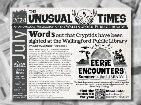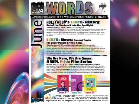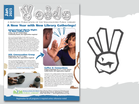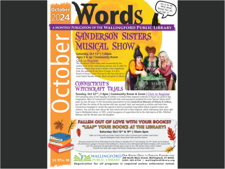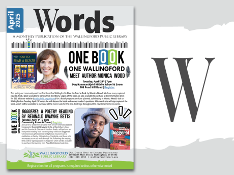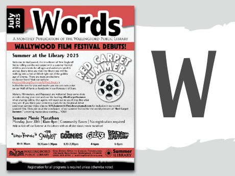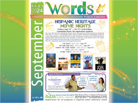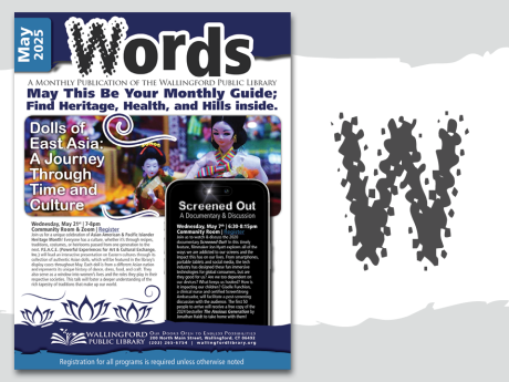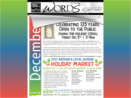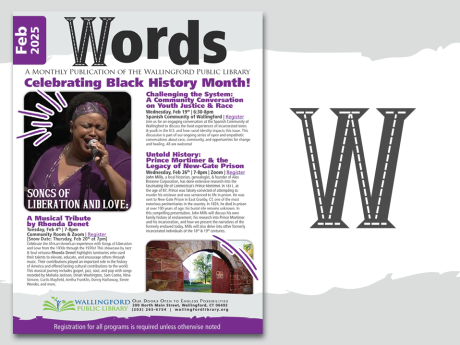 Words is the Wallingford Public Library’s monthly newsletter containing library news, information, and upcoming events. You can pick up a print copy of the newsletter at the library or become a member of the Wallingford Public Library Association to have the newsletter emailed to you each month. If you are viewing the newsletter online you can click the links throughout to register for various programs and events.
